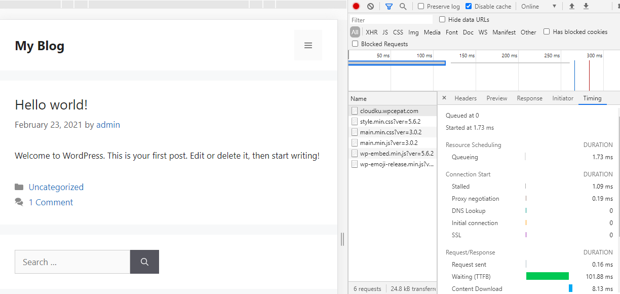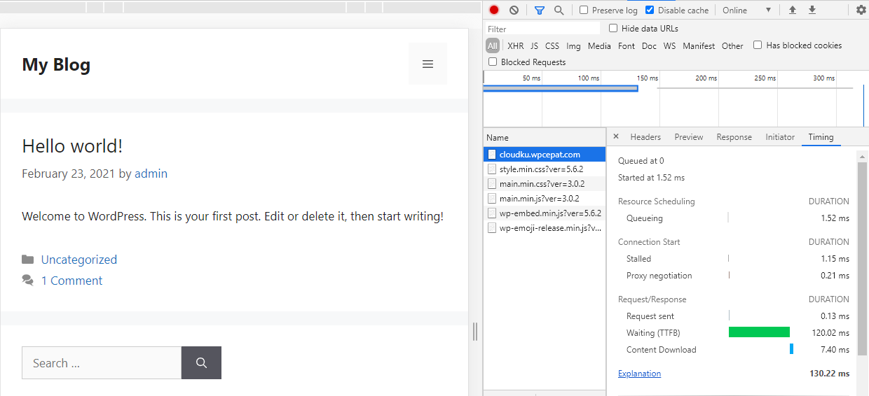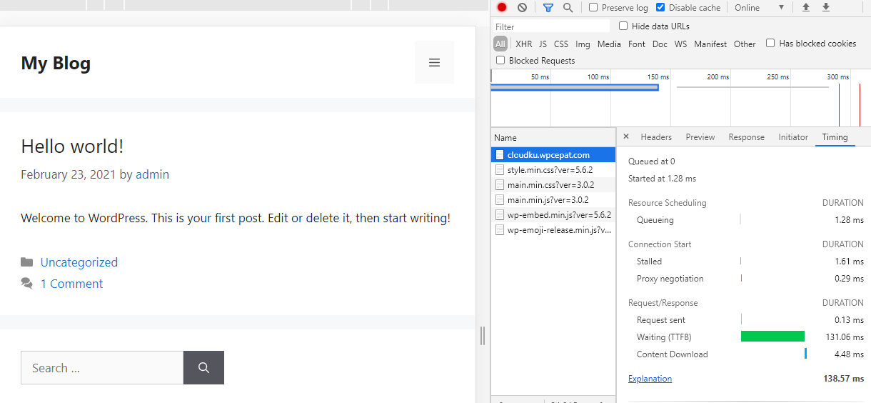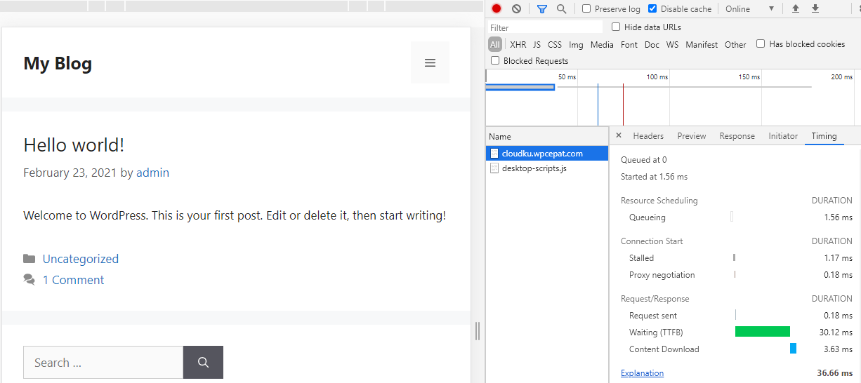 Pengujian standar setelah instalasi pada server cloud cpanel dengan settingan disable browser cache. Pengujian ini dilakukan untuk melihat performa TTFB website secara real time menggunakan kecepatan internet user.