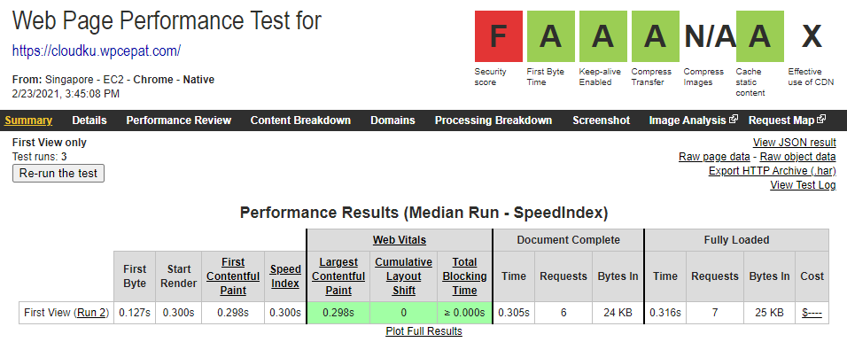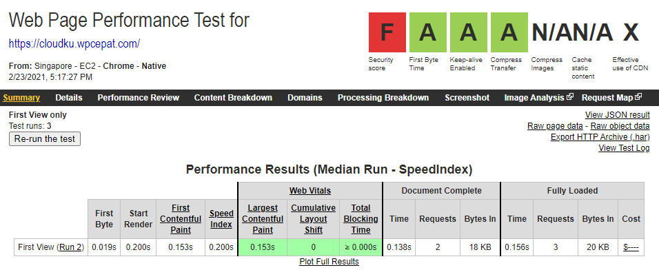 Dari pengujian diatas, terlihat bahwa ttfb dari server singapura untuk versi default adalah 127ms dan versi optimized adalah 19ms.