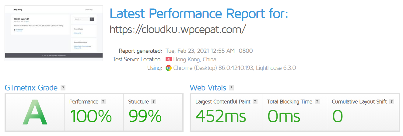 Performa dasar cloudku memuat LCP halaman dalam 452ms.