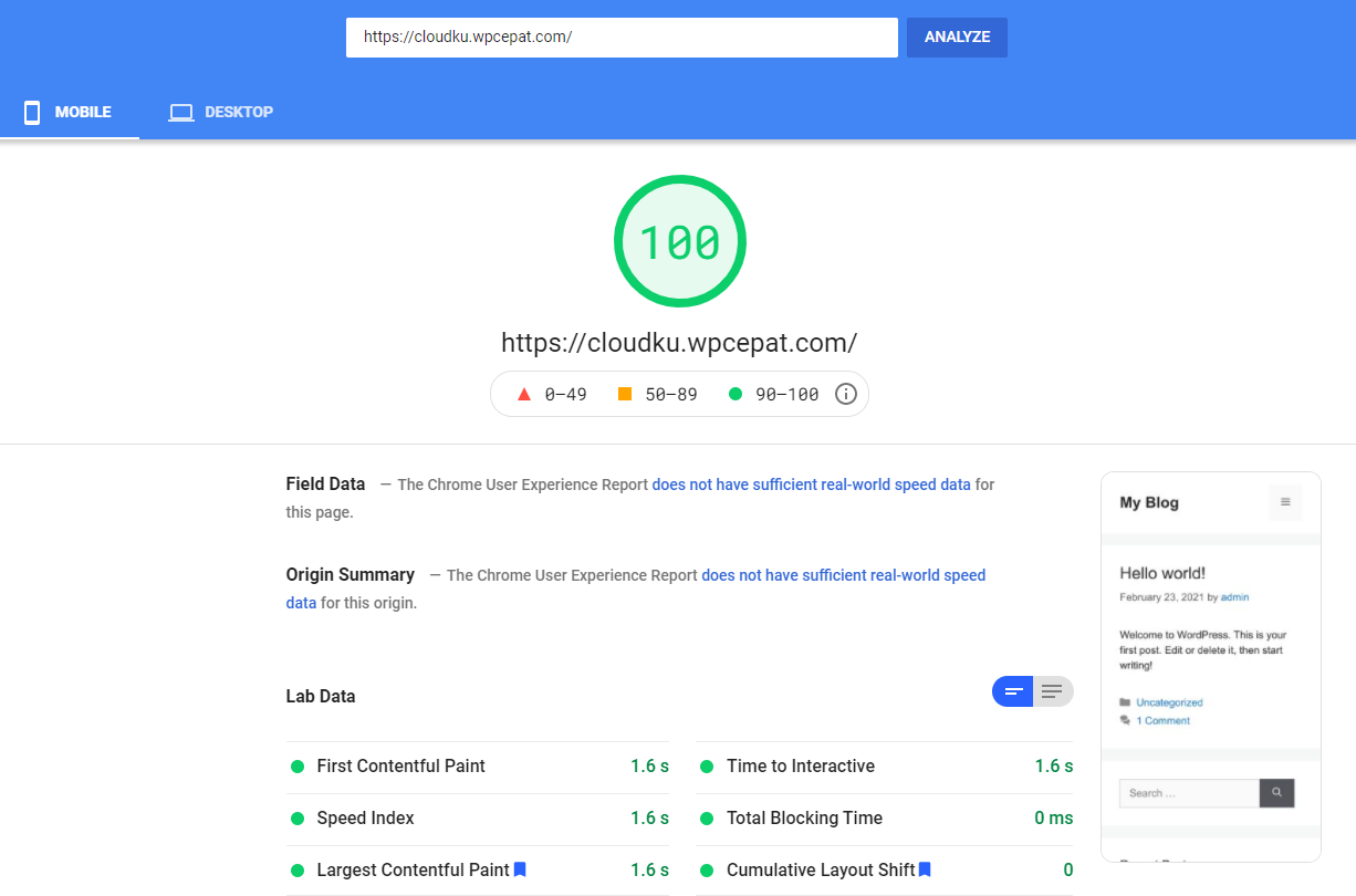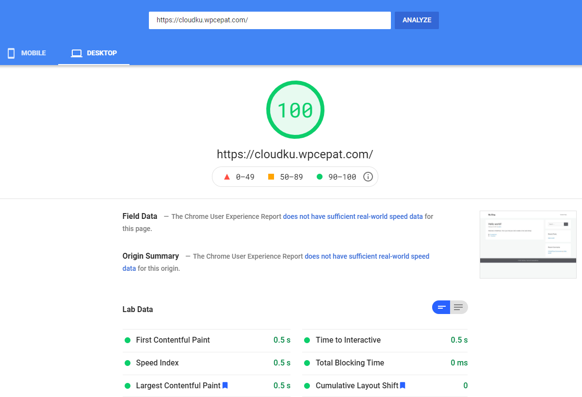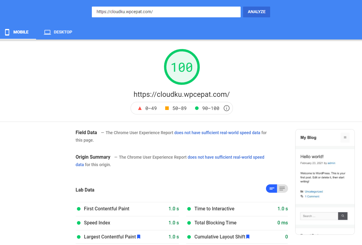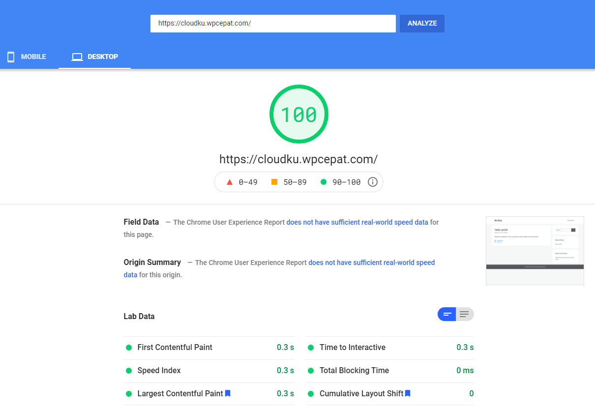 Setelah dioptimasi standar, hasilnya halaman selesai dalam 0.3 detik pada desktop dan 1 detik pada mobile.