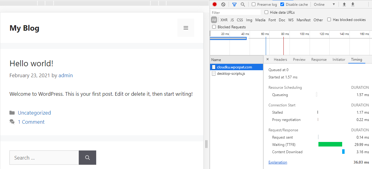 Dari hasil 3x pengujian devtools diatas untuk masing-masing versi default dan optimized, TTFB tercepat didapatkan pada 29ms untuk versi real user.