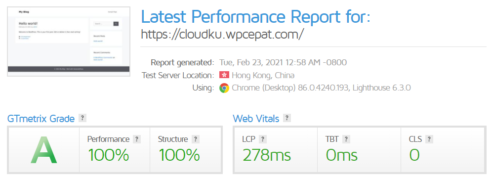 Dengan optimasi standar, website yang di host pada cloudku ini bisa menjadi hampir 2x lebih cepat dan LCP dimuat dalam 278ms dan <500ms yang berarti instant load.