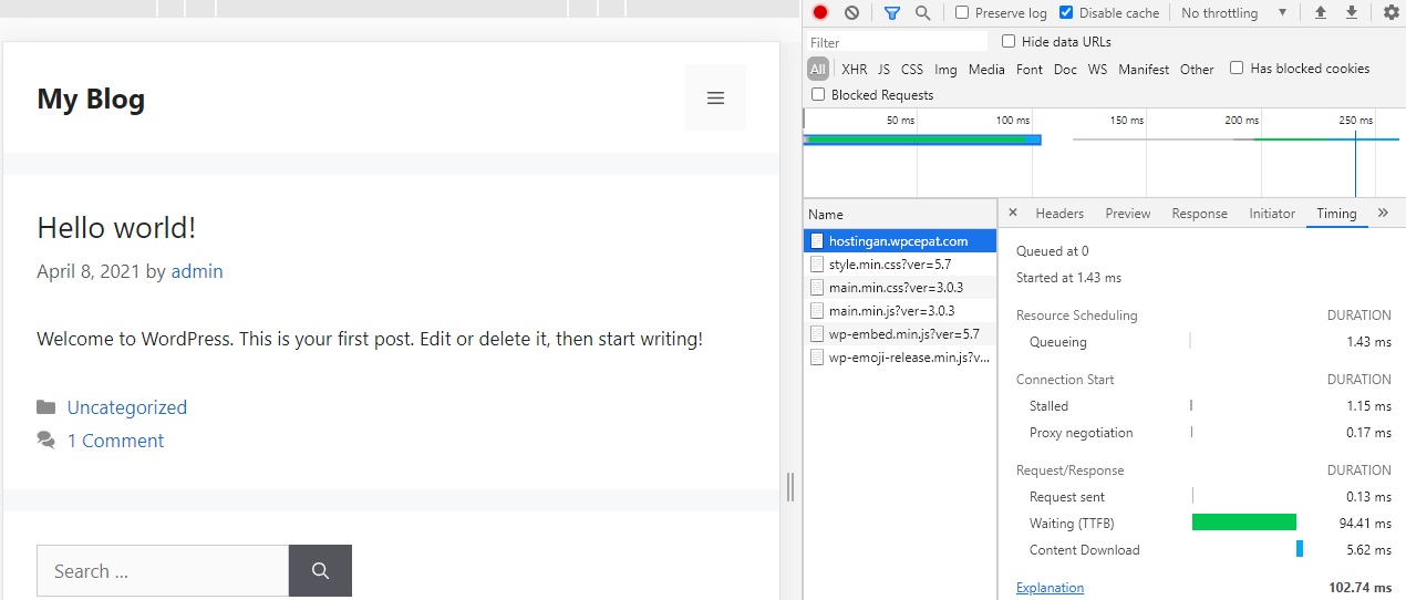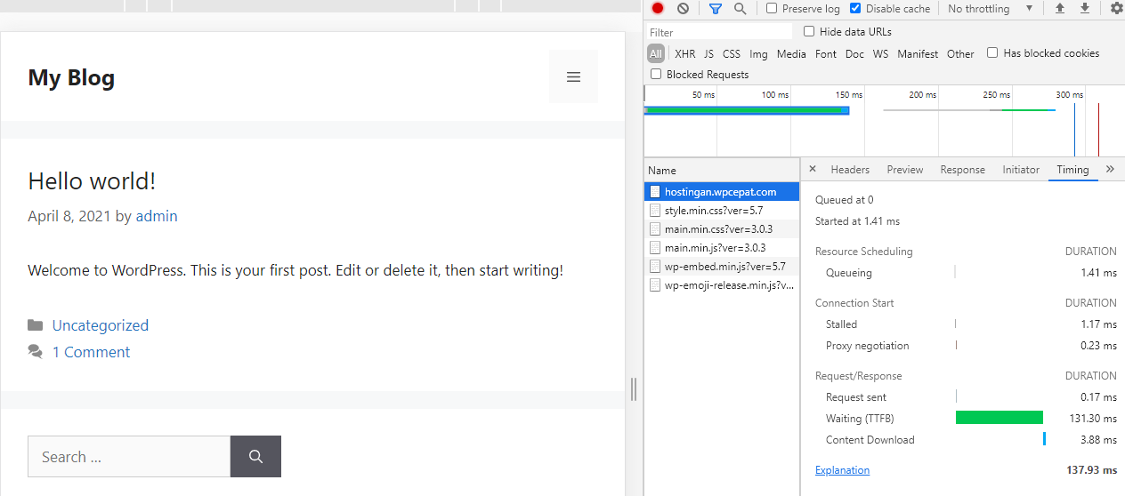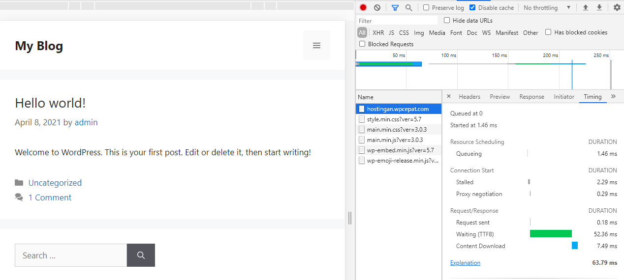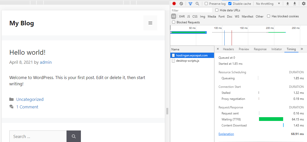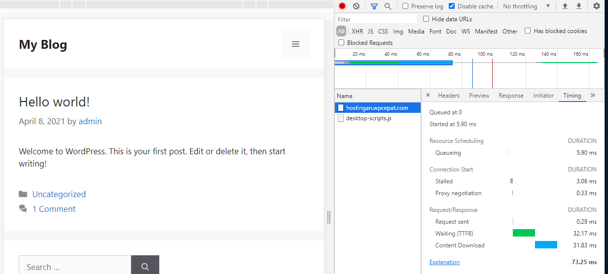 Pengujian standar setelah instalasi pada server cloud hosting dengan settingan disable browser cache. Pengujian ini dilakukan untuk melihat performa TTFB website secara real time menggunakan kecepatan internet user.