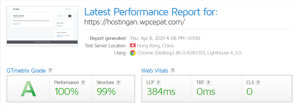 Performa dasar hostingan memuat LCP halaman dalam 384ms.