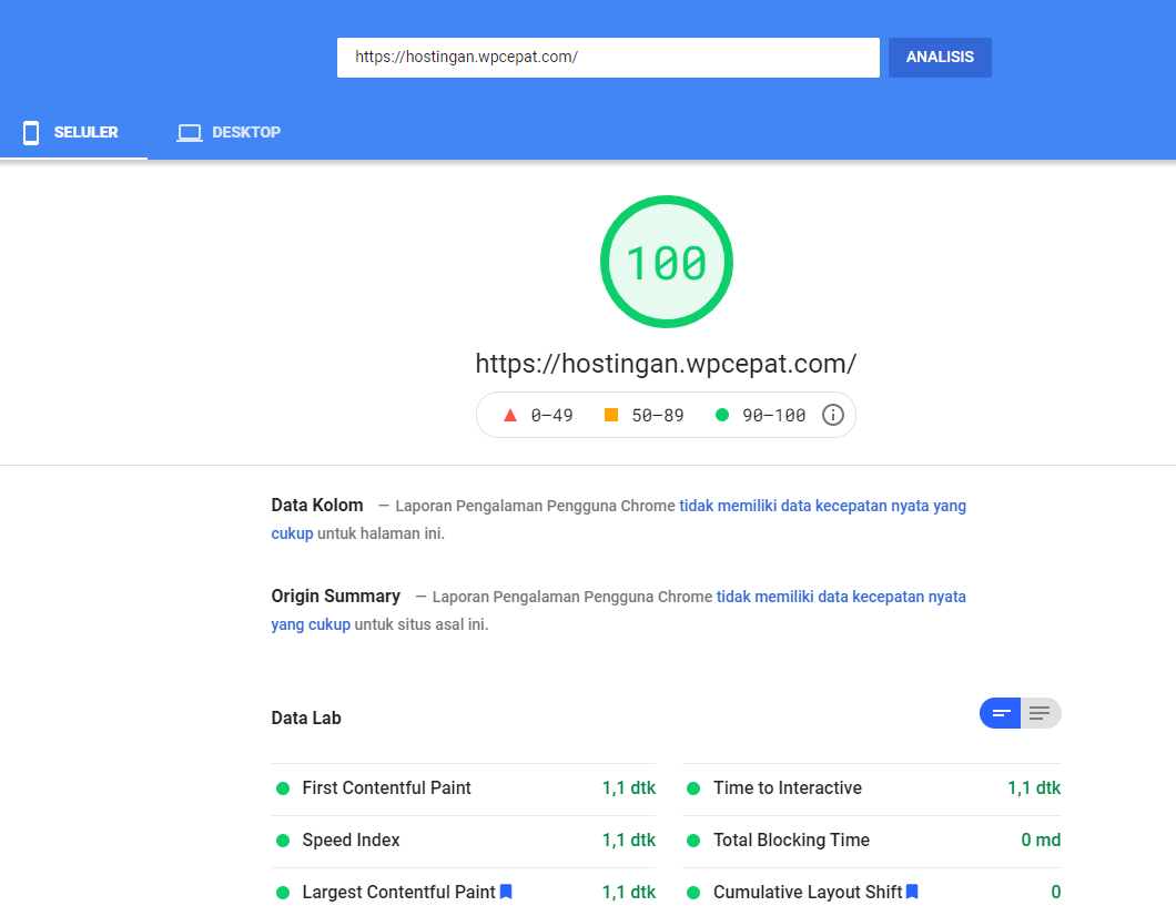 Secara default menurut pagespeed insight, halaman website dapat diakses dengan baik dalam 0.3 detik pada desktop dan 1.1 detik pada mobile.