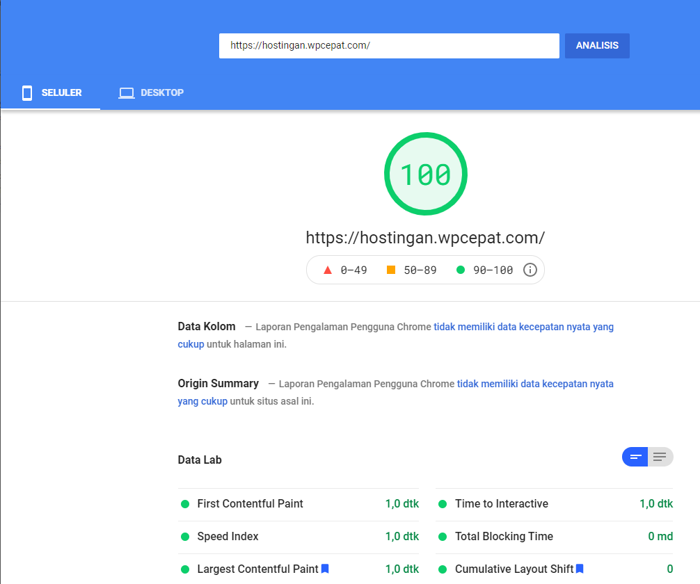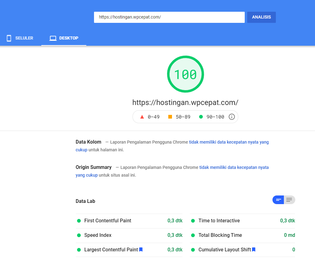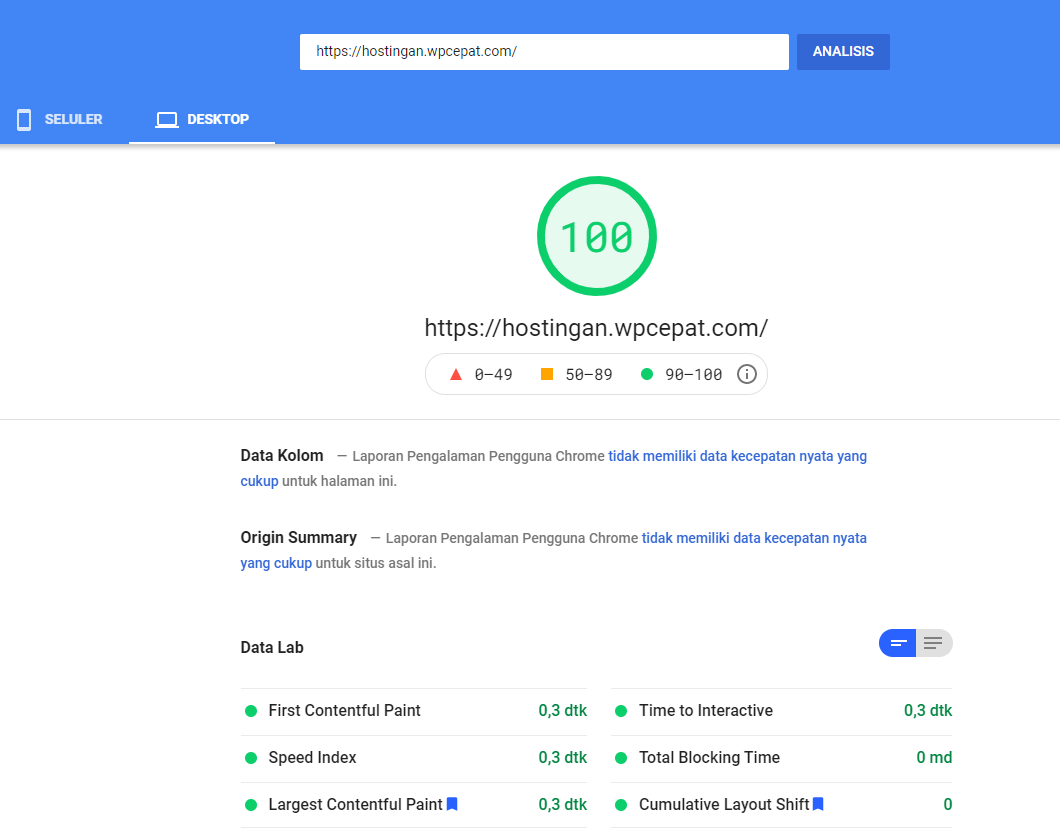 Setelah dioptimasi standar, hasilnya halaman selesai dalam 0.3 detik pada desktop dan 1 detik pada mobile.