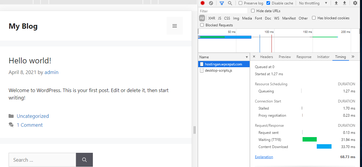 Dari hasil 3x pengujian devtools diatas untuk masing-masing versi default dan optimized, TTFB tercepat didapatkan pada 31ms untuk versi real user.
