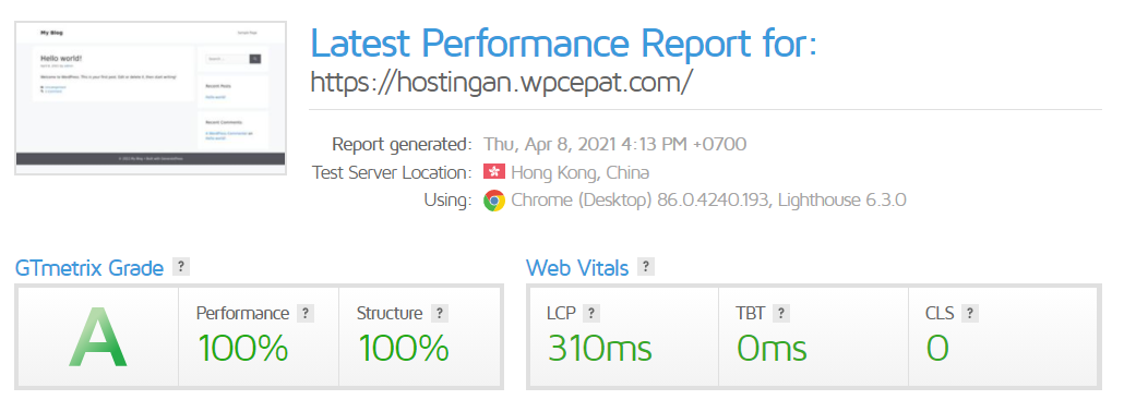 Dengan optimasi standar, website yang di host pada hostingan ini bisa menjadi lebih cepat dan LCP dimuat dalam 310ms.