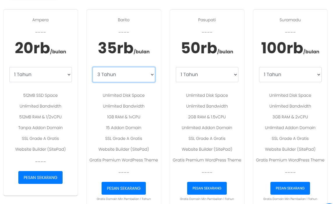 Untuk pricing unlimited hosting murah saat saya membuat review ini dimulai dengan 20 ribu/bulan.
