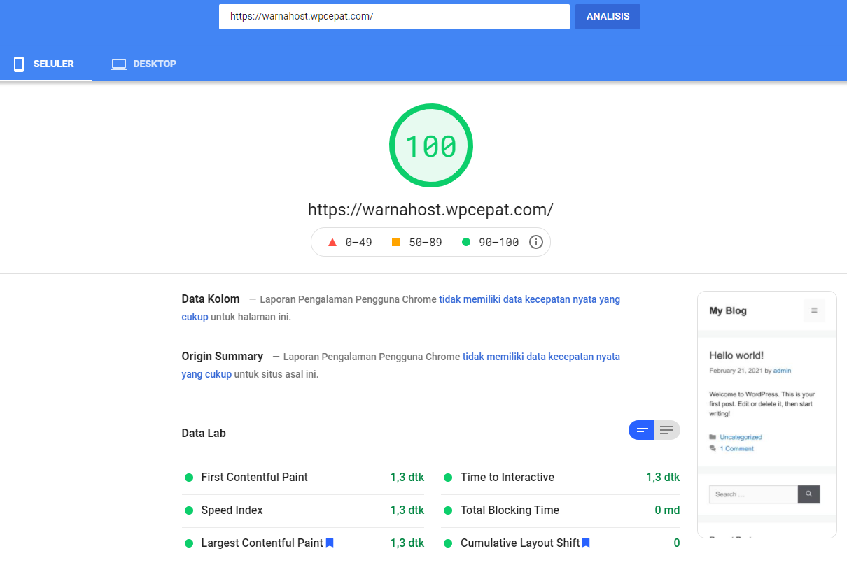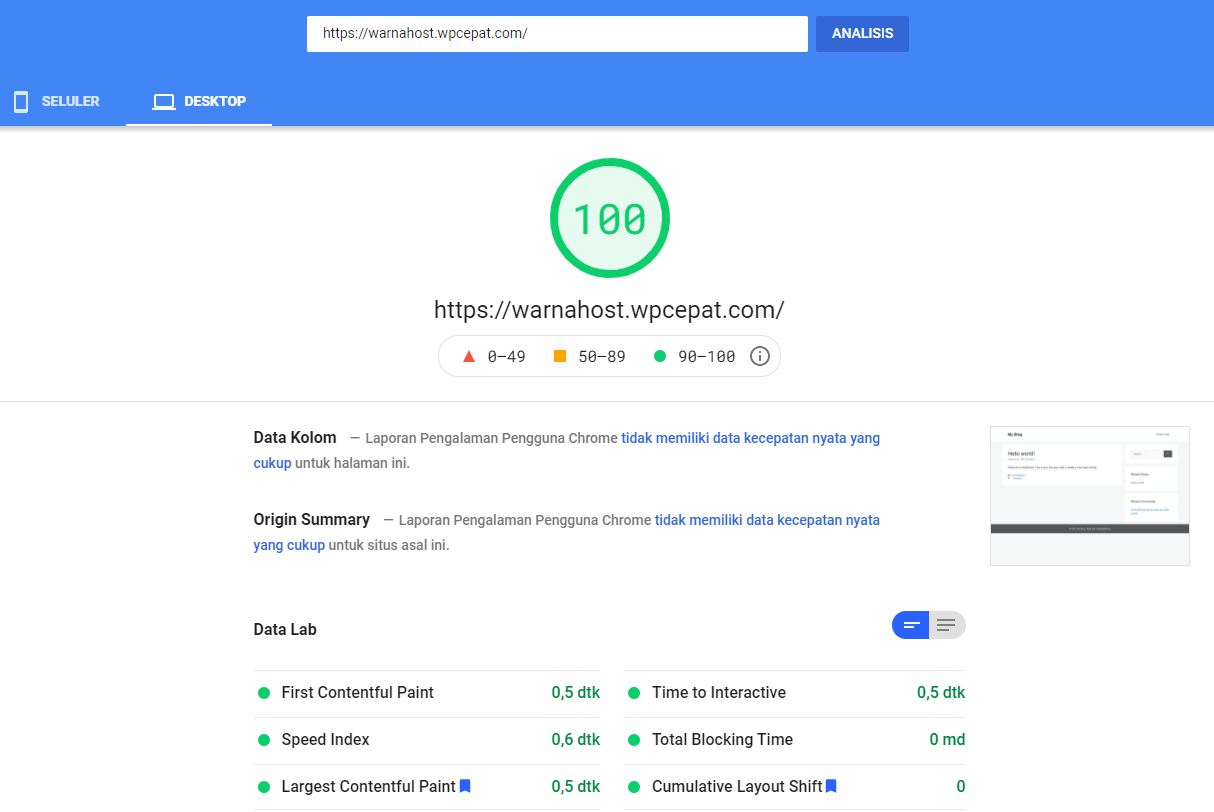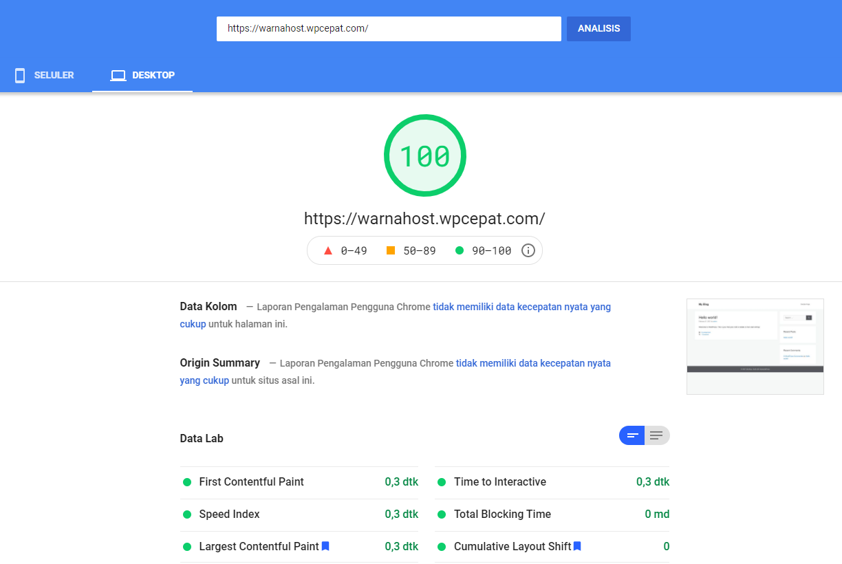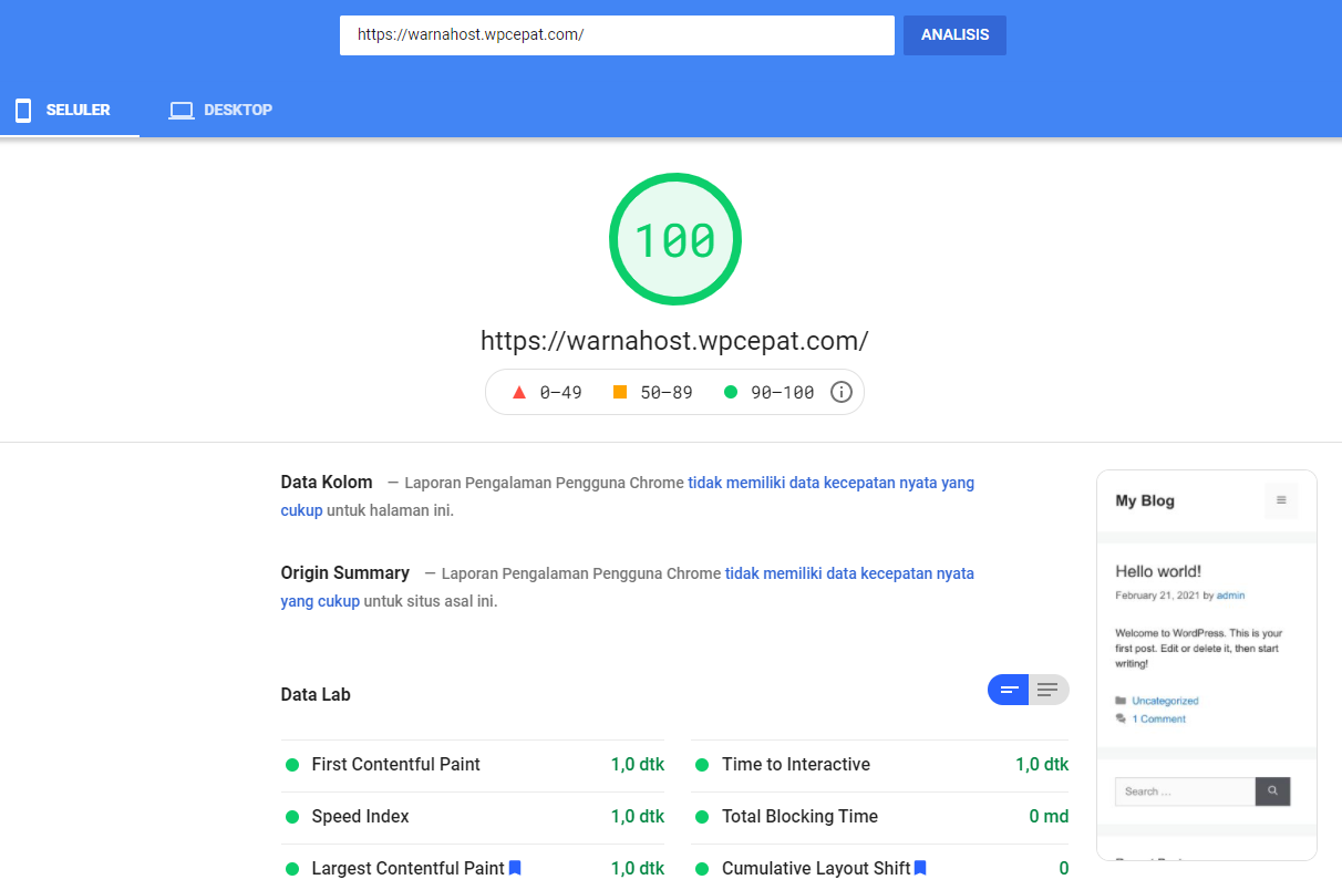Setelah dioptimasi standar, hasilnya halaman selesai dalam 0.3 detik pada desktop dan 1 detik pada mobile