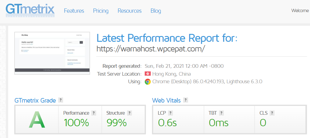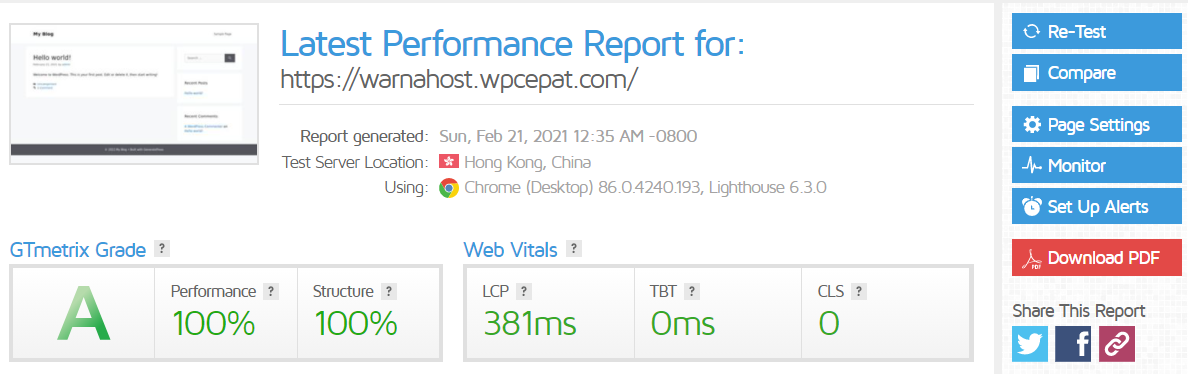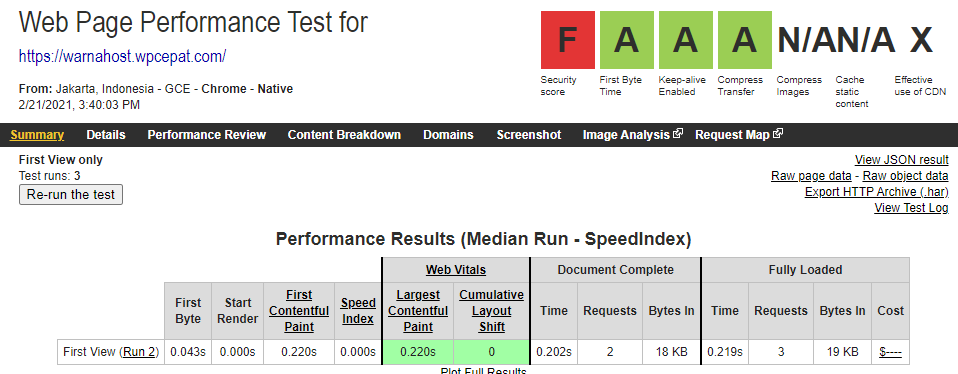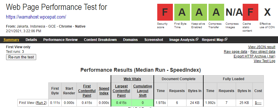 Dengan optimasi standar, website yang di host pada warnahost ini bisa menjadi hampir 2x lebih cepat dan LCP dimuat dalam 381ms dan <500ms yang berarti instant load.