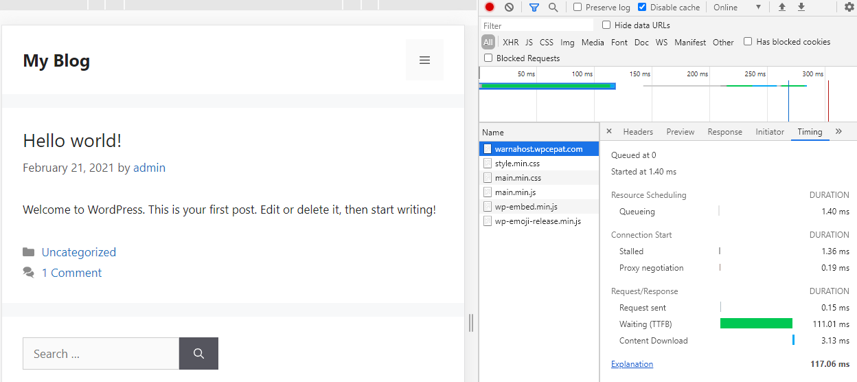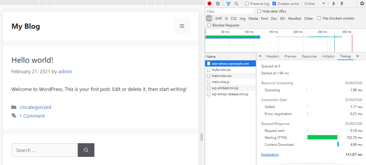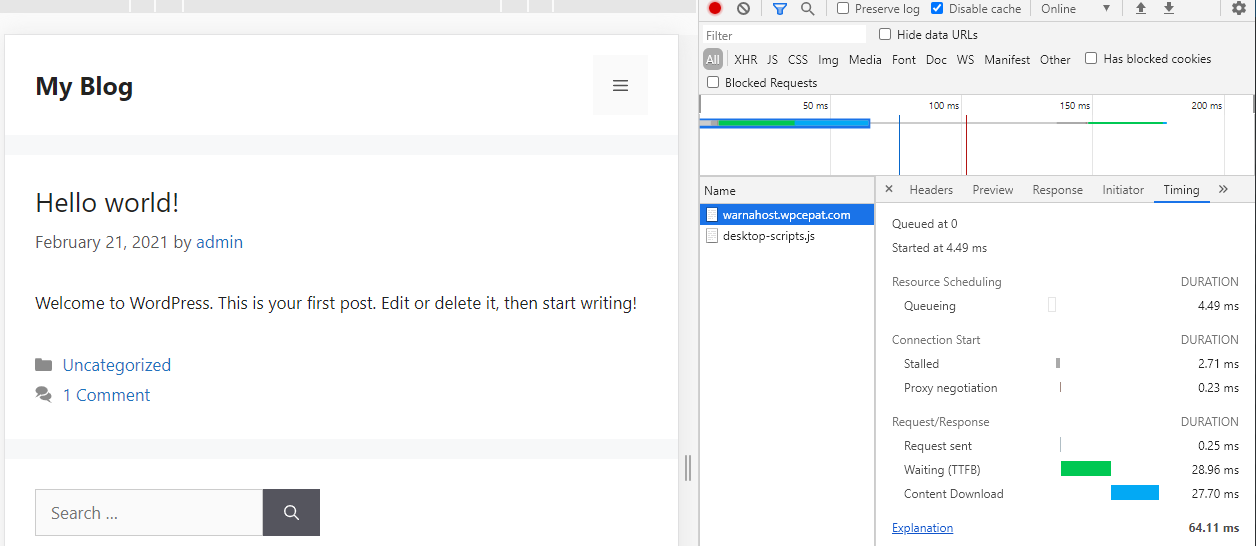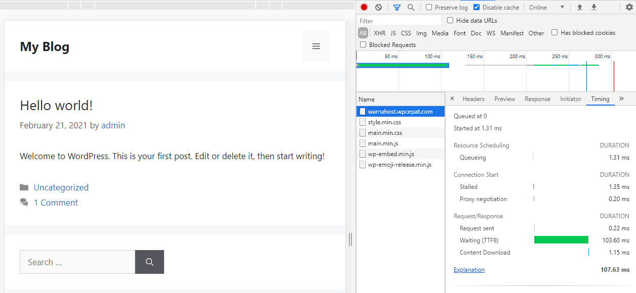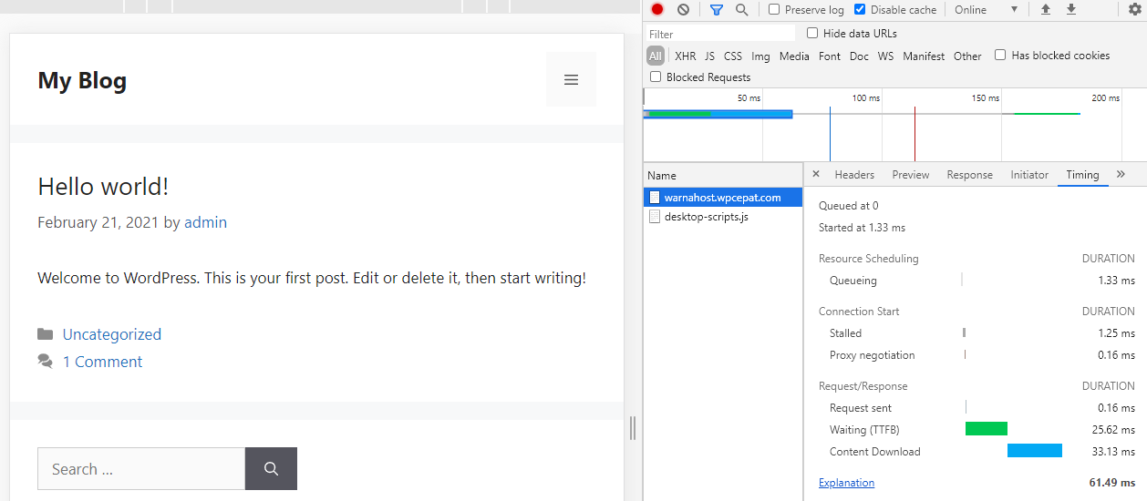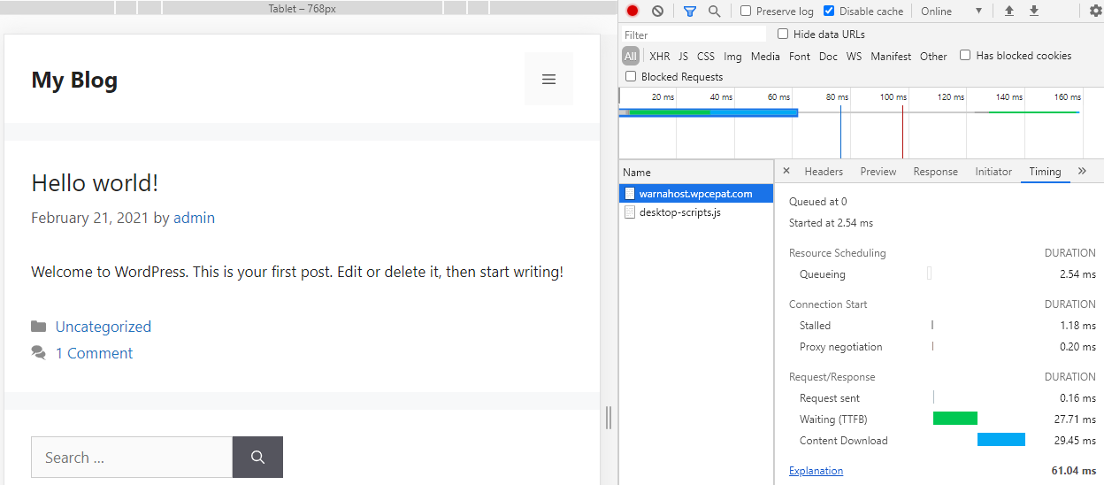 Pengujian standar setelah instalasi pada server warnahost dengan settingan disable browser cache. Pengujian ini dilakukan untuk melihat performa TTFB website secara real time menggunakan kecepatan internet user.