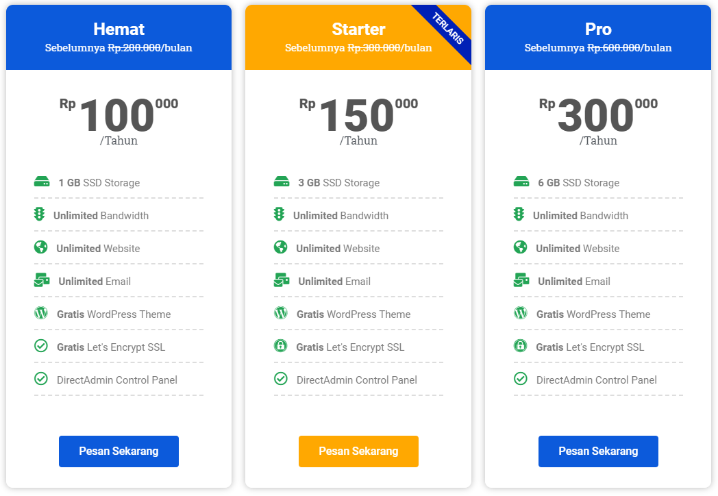 Pricing hosting murah saat saya membuat review ini dimulai dengan 100 ribu/tahun untuk panel directadmin.